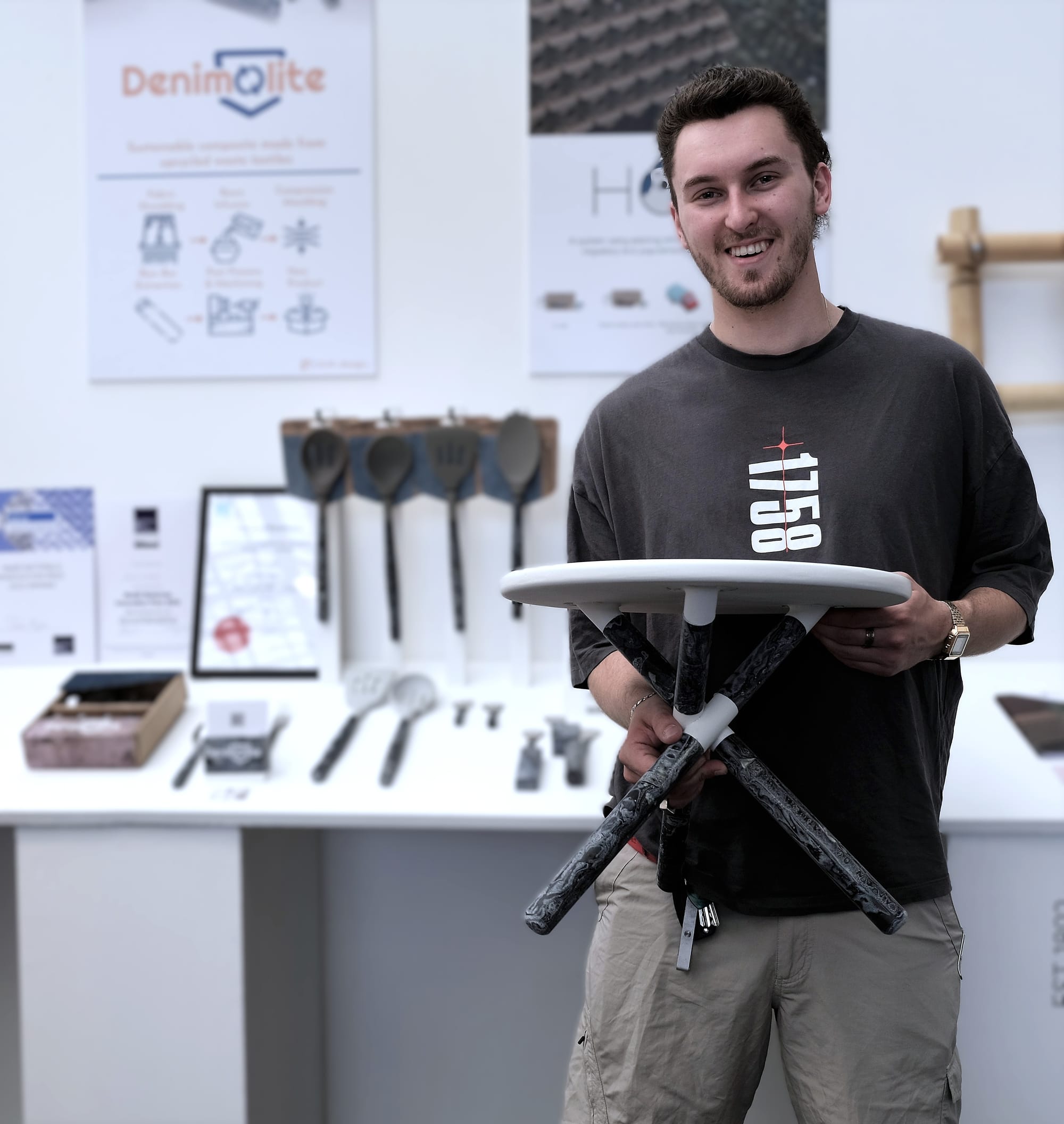Josh Myers is showing Denimolite, a robust, machinable board made from waste denim, with a blue marbled finish that never repeats.