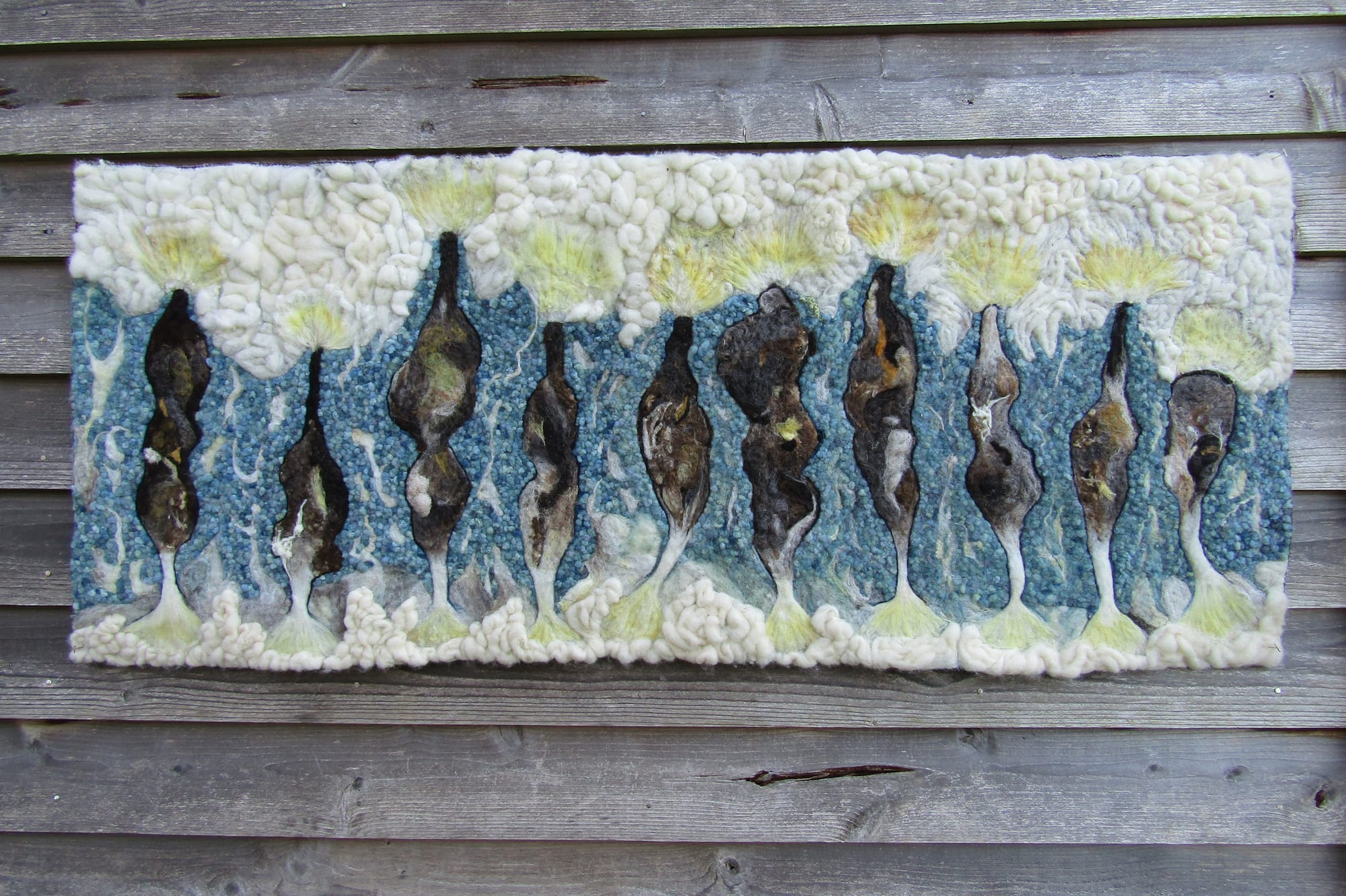 Mandy Roland-Smith produces needle-felted panels, often dramatic in scale, working exclusively with wool sourced within a six-mile radius of her home and dyed with locally gathered plant-based dyes.