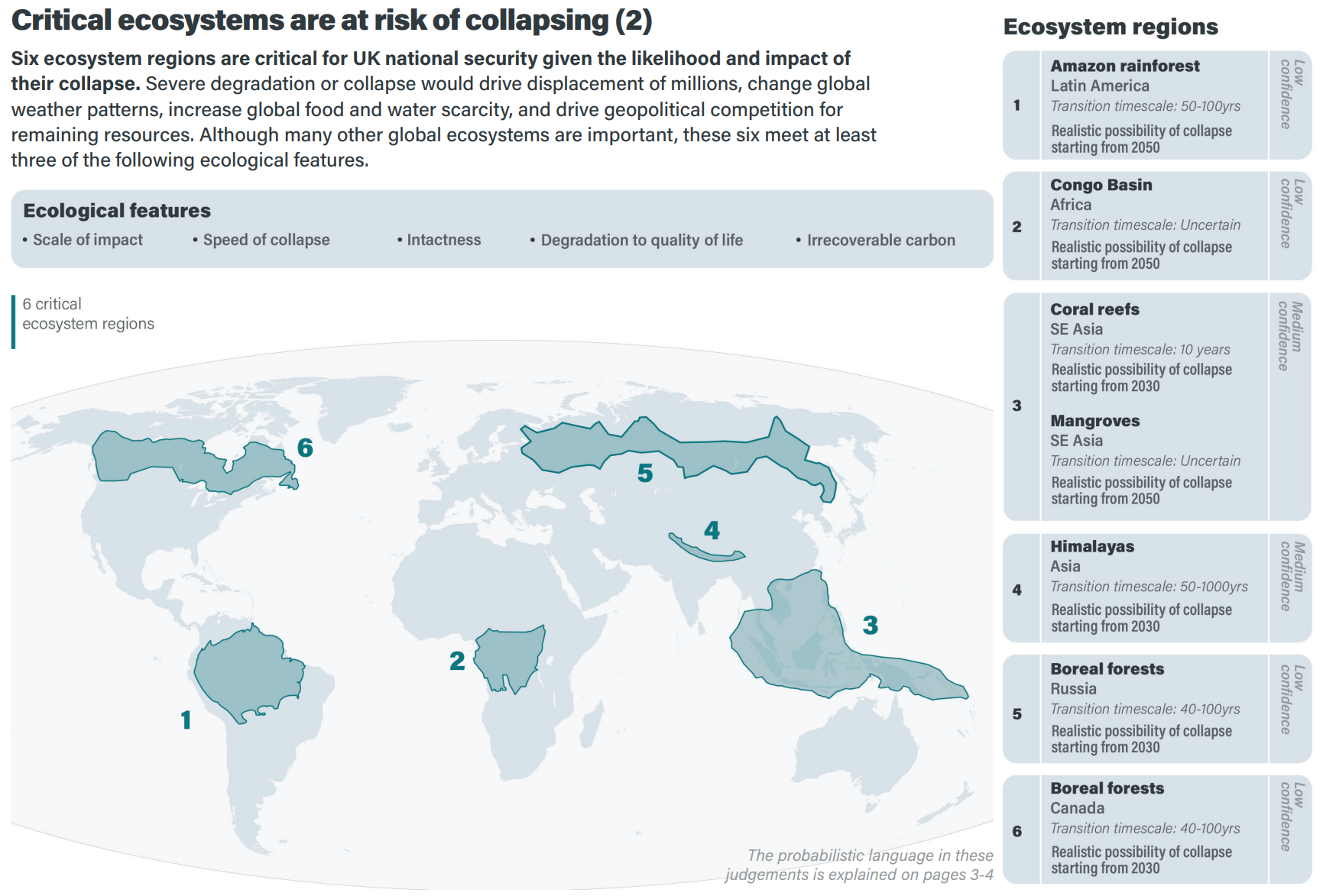 The report identifies six ecosystems of strategic importance for the UK and explores how their decline could drive cascading global impacts. The startling thing is that every critical ecosystem is on a pathway to irreversible collapse with high confidence.