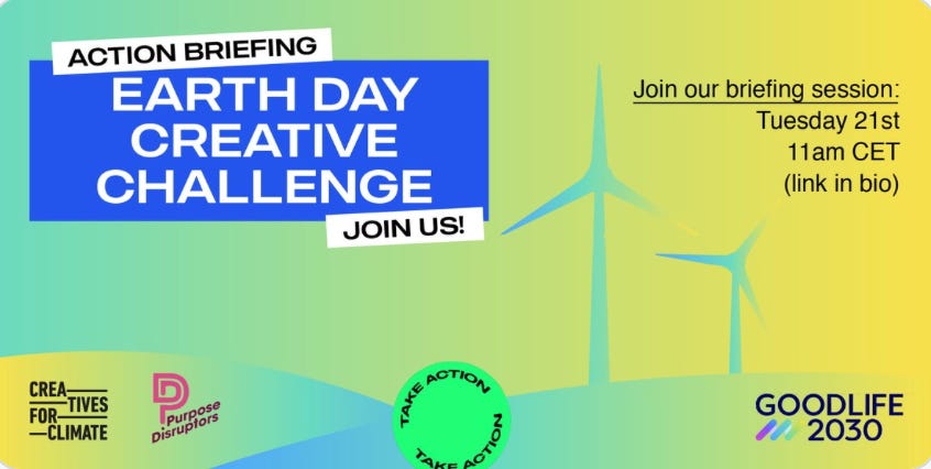 Creatives for Climate has joined forces with Purpose Disruptors’ Good Life 2030 project, inviting advertising creatives to come up with ‘Ads For The Future’, showing how a 2030 Good Life is about more connection, not consumption. The two organisations will host a call on 21 March with details for those who wish to get involved. Register here.