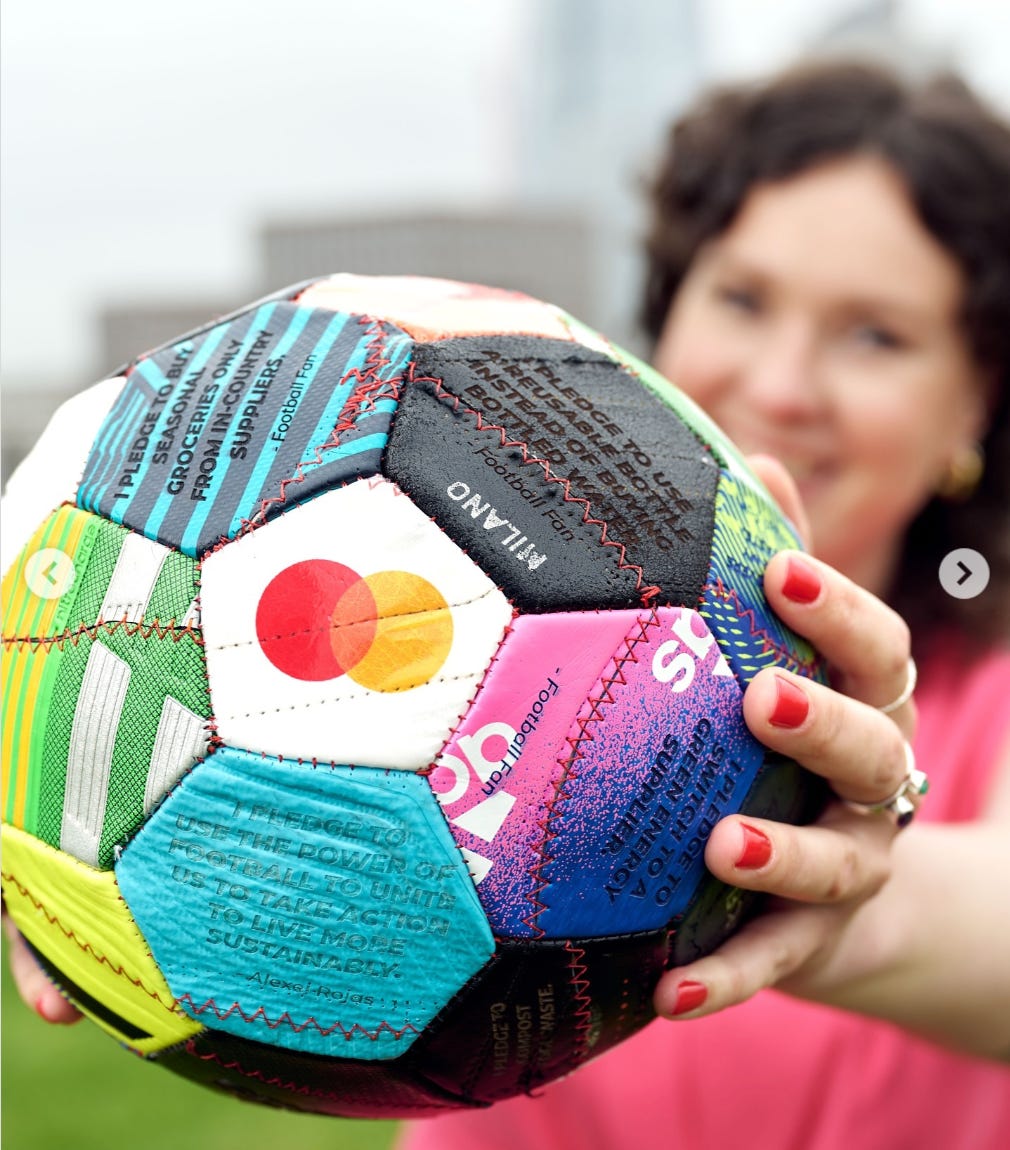 Designer Helen Kirkham made us smile this week with her one of a kind football made from 30 pairs of pre-loved boots, each with a story to tell, she deconstructed them, and engraved them with sustainable pledges from the football community.