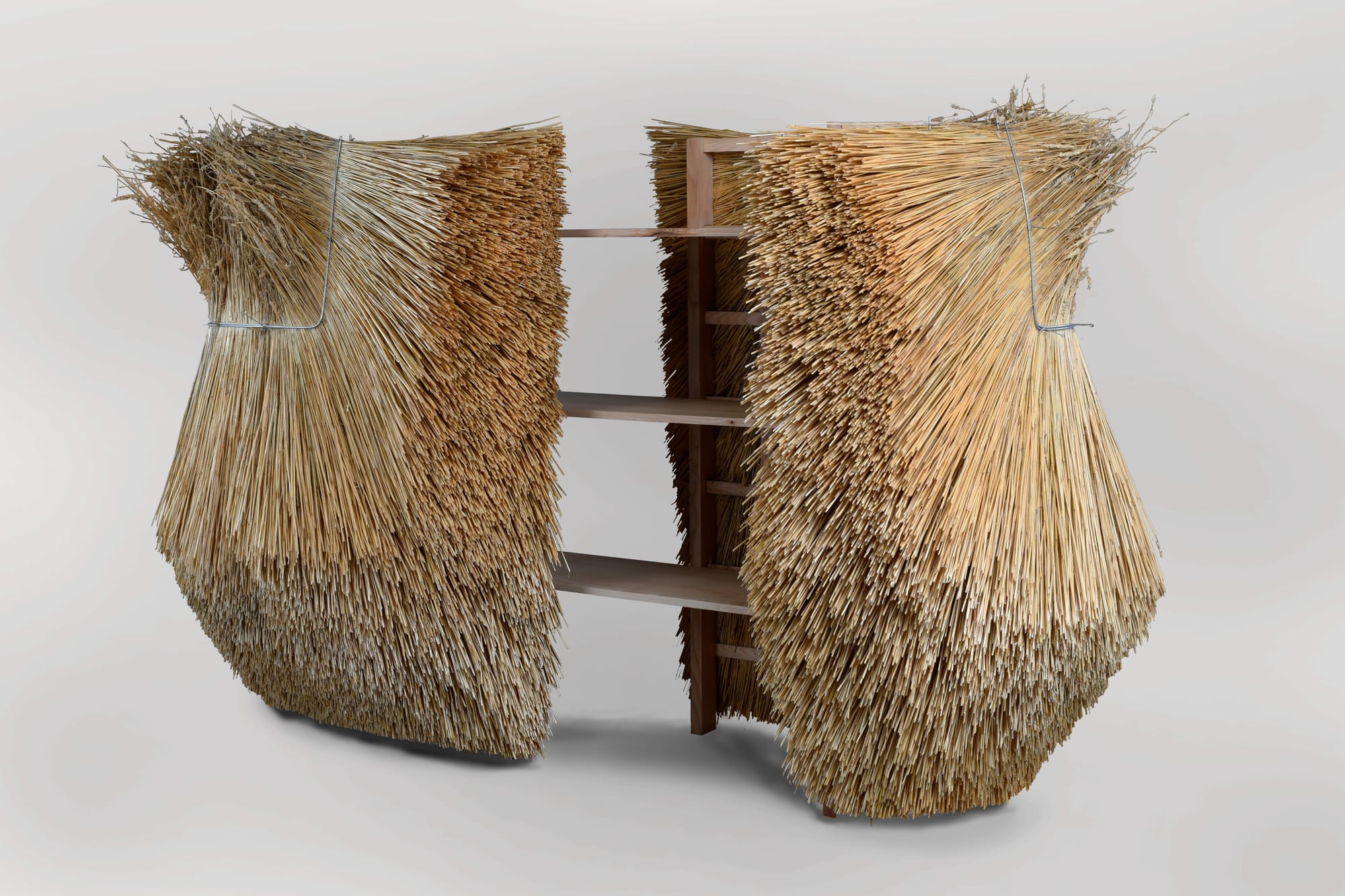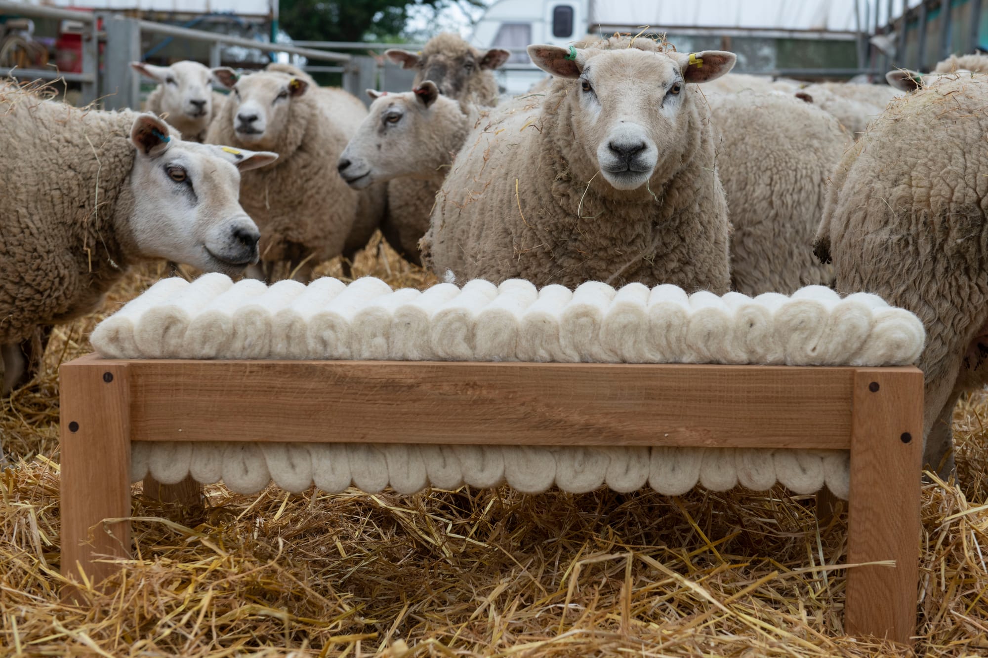 Across the blue changing rooms, visitors will find new ideas in biomaterials, regenerative craft, and creative reuse, from Robert Radcliffe’s straw furniture and Freya Boothroyd’s Peak District clay to Maddie Sturmey and Claire Malley’s work with waste wool and textiles.