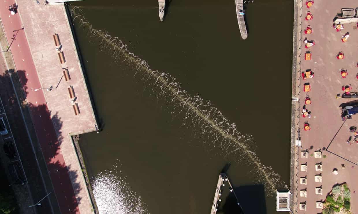 The Guardian reports on the apparent success of the world’s first river ‘Bubble Barrier’ – “an experimental concept where a 120-metre stream of rising bubbles, plus the water current, pushes plastic waste to one side in order to be collected”. “We place a perforated tube on the bottom of the waterway, at an angle, and then pump through compressed air: the rising air bubbles create an upward current that will lift plastic from the water column to the surface, and then at the surface – together with the flow of the river – it is all pushed to one side,” explains Philip Ehrhorn, the chief technology officer at the Dutch startup The Great Bubble Barrier. More here